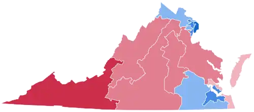 The 108 delegates (95 pledged delegates and 13 super delegates) from Virginia to the Democratic National Convention were allocated in this way. Among the pledged delegates, 62 were allocated based on the popular vote in each congressional district. The 33 at-large delegates were then allocated based on the statewide popular vote.[4]