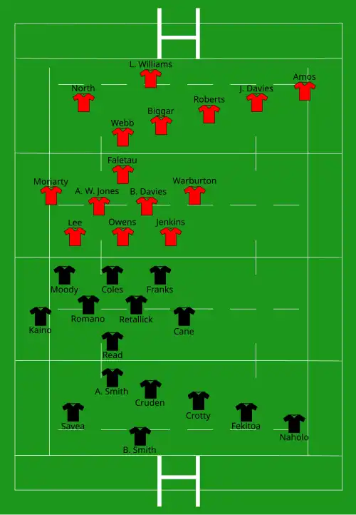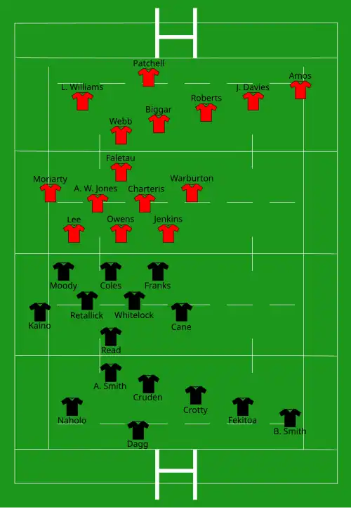 - Bench players Gareth Anscombe and Ross Moriarty was pulled out of the team moments before kick-off due to injury and replaced by Taulupe Faletau and Jamie Roberts.
