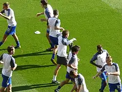 Leicester City players warming up before a Premier League match Manchester United in August 2017 | ||||