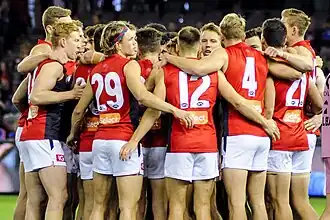 ![]() Melbourne huddle during the round 13 match against the Western Bulldogs | |