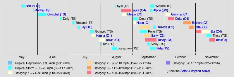 The season officially started on June 1 and officially ended on November 30. However, tropical cyclogenesis is possible at any time of the year, as demonstrated by the early formation of Tropical Storms Arthur and Bertha, on May 16 and 27, respectively. This was the sixth consecutive year with a pre-season system and the second of these seasons to have two, with the other being 2016.[4] The first hurricane, Hurricane Hanna, made landfall in Texas on July 25. Hurricane Isaias formed on July 31, and made landfall in The Bahamas and North Carolina in early August, both times as a Category 1 hurricane; Isaias caused $4.8 billion in damage overall.[nb 4] In late August, Laura made landfall in Louisiana as a Category 4 hurricane, becoming the strongest tropical cyclone on record in terms of wind speed to make landfall in the state, alongside the 1856 Last Island hurricane and Ida. Laura caused at least $19 billion in damage and 77 deaths. September was the most active month on record in the Atlantic, with ten named storms. Slow-moving Hurricane Sally impacted the United States Gulf Coast, causing severe flooding. The Greek alphabet was used for only the second and final time, starting on September 17 with Subtropical Storm Alpha, which made landfall in Portugal on the following day.