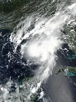 On June 1, the remnants of Eastern Pacific Tropical Storm Amanda entered the Bay of Campeche, quickly redeveloping into Tropical Depression Three. On the next day, it strengthened into Tropical Storm Cristobal, which strengthened while moving southeastward.[nb 6] The storm made landfall just west of Ciudad del Carmen at 13:35 UTC on June 3 at its peak intensity of 60 mph (95 km/h). Cristobal weakened into a tropical depression over land, but restrengthened as it moved back over the Gulf of Mexico. Cristobal dropped rainfall throughout the Yucatán Peninsula, reaching 9.6 in (243 mm). Three people died in Mexico due to the storm.[27] In El Salvador, a mudslide caused seven people to go missing.[79] Once back over water, Cristobal reattained winds of 60 mph (95 km/h) before encountering unfavorable conditions. Late on June 7, the storm moved ashore southeastern Louisiana, and weakened to a tropical depression as it continued northward. Cristobal became an extratropical low on June 10 over Iowa, and lasted two more days before dissipating over the Hudson Bay.[27] Cristobal killed three people in the United States.[27] Overall damage was estimated at US$665 million.[28]