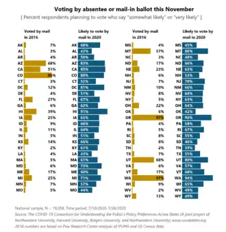 The central issues of the election included the public health and economic impacts of the COVID-19 pandemic; civil unrest in reaction to the police murder of George Floyd, the Supreme Court following the death of Ruth Bader Ginsburg and confirmation of Amy Coney Barrett, and the future of the Affordable Care Act.[13] Due to the ongoing pandemic, a record number of ballots were cast early and by mail.[14] Thirty-eight states had over half of all votes cast using these methods, and only three states had fewer than 25%.[15] As a result of a large number of mail-in ballots, some swing states saw delays in vote counting and reporting; this led to major news outlets delaying their projection of Biden and Harris as the president-elect and vice president-elect until the morning of November 7, 2020.[16]