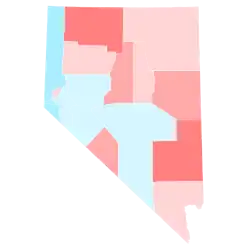 Most counties in the state of Nevada are rural and sparsely populated, and voted heavily for Trump. However, Biden won the two most populous counties, Clark and Washoe, which make up almost 89% of Nevada's population.[3] The state's three largest cities are located in these counties: Las Vegas and Henderson in the former, and Reno in the latter. His strength in these areas was likely due to high presence of minority and union voters: Biden's strength came from heavy turnout among culinary unions in populous Clark County, anchored by Las Vegas. Biden had the backing of Culinary Union Local 226, based on right-to-work standards.[4] Additionally, Biden was able to win about 43% and 34% of votes in the tourism-heavy Lake Tahoe areas of Carson City and Douglas County respectively, sealing his victory in the state. Nevada weighed in for this election as 2.1% more Republican than the nation-at-large.