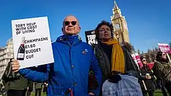 The campaigner Jack Monroe warned that the crisis could be fatal for some of the children of low-income parents, and asked the government to increase benefits in line with inflation.[53] UK civil society continues to respond to the hardship caused by the cost-of-living crisis, such as by running foodbanks, though some foodbank managers report both extra demand but also lower levels of donations, as the crisis means some people who could previously donate can no longer afford to do so.[54][55] On 18 June 2022, thousands of workers marched to Parliament in London to demand further government action for the cost-of-living crisis.[56]