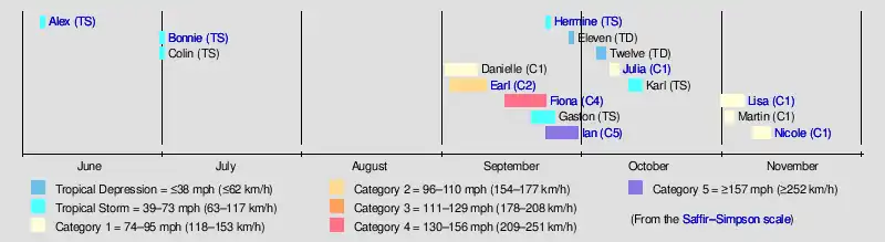 Tropical Depression Nine became Hurricane Ian, the deadliest and most destructive storm of the season. Ian made landfall in western Cuba and crossed the Florida Keys as a Category 3 hurricane, before briefly becoming a Category 5 hurricane. It then made landfall in southwestern Florida as a high-end Category 4 hurricane, with winds of 150 mph (240 km/h), the strongest storm to hit the area in terms of windspeed. The storm later made landfall in South Carolina as a Category 1.[31] Tropical Depression Ten attained tropical storm strength first, becoming Tropical Storm Hermine.[45] It was one of the easternmost Atlantic tropical storms on record,[46] and brought heavy rainfall to the Canary Islands.[45] Next, Tropical Depression Eleven formed during the last week in September, and then Tropical Depression Twelve formed one week later. Ultimately, neither cyclone strengthened into a tropical storm.[47][48] Soon thereafter, Hurricane Julia formed just off the coast of Venezuela on October 7. After traversing Nicaragua intact, Julia entered the Pacific basin.[49] Not since 1996 has more than one storm crossed between the Atlantic and Pacific basins intact during a single season.[50] On October 11, Tropical Storm Karl formed in the Bay of Campeche, moved erratically over open waters, before degenerating into a remnant low offshore of Mexico three days later.[51] Hurricane Martin was the second largest Atlantic hurricane on record as measured by diameter, behind only Hurricane Sandy, with tropical-storm-force winds spanning 1,040 miles (1,670 km).[52][53] Martin and Lisa were both at hurricane strength on November 2, thus, for the first time since Michelle and Noel in 2001, two Atlantic hurricanes were at hurricane strength simultaneously during November.[54] Soon thereafter, Hurricane Nicole formed on November 7, also tying 2001 for the most hurricanes in November, with three.[27] Nicole impacted the Greater Antilles, the Bahamas, and the Eastern United States, becoming the first hurricane to strike Florida in the month of November since Hurricane Kate in 1985.[33] The storm was absorbed by a trough over North Carolina on November 11, ending activity for the season.[55]