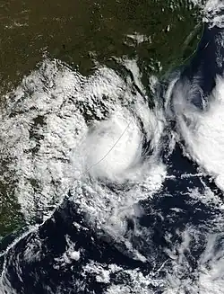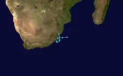 On the 12th of April, the low-pressure system was classified as a subtropical depression and designated Subtropical Depression Issa by Météo-France, due to its structure and presence of gale-force winds.[12] Following its southwestern trajectory along the South African east coast and after reaching the northeastern coast of the Eastern Cape on the morning of 13 April, the system turned northward, continuing back along the South African east coast in a northeasterly direction before moving out to sea and further weakening.[13]