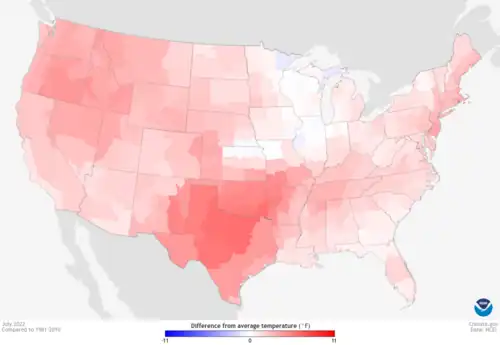 ![]() A map provided from NOAA of the temperature anomalies across the Contiguous United States in July 2022 | |