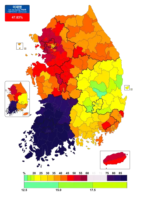 In the closest presidential election in South Korean history, Yoon won the most overall votes and the key area of Seoul, but lost in Gyeonggi Province and Incheon. In addition, this was the country's first ever direct presidential election in which the national winner failed to secure Jeju Province, a traditional bellwether region.