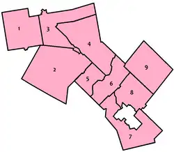 Wellington County Council consists of the seven mayors of the constituent municipalities plus nine councillors elected from county wards.[1]