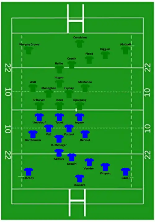 Try: Llorens 11' m Sansus (2) 23' m, 47' c Forlani 30' m Joyeux 37' m Boulard 66' c Con: Drouin (1/5) 48' Trémoulière (1/1) 67' Pen: Drouin (2/2) 3', 18' | Report | Try: Higgins 55' m |