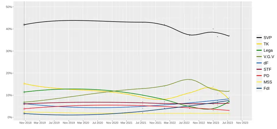 Date | Polling firm | Sample size | SVP | TK | Lega | V-G-V | dF | STF | PD | M5S | FdI | FI | Enzian | FSmW | JWA | Vita | Others | Lead |