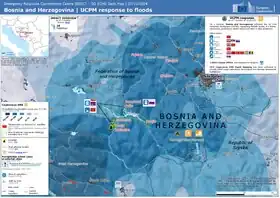 Twelve countries offered help through the EU Civil Protection Mechanism, which was activated by Bosnia and Herzegovina on 5 October.[29] Teams from Croatia,[30] Slovenia, Montenegro, Serbia and the United Kingdom[31] participated in the rescue efforts. The European Union provided satellite photos from the Copernicus Programme to help the authorities estimate damages. Albania, Hungary, Montenegro, Romania and Turkey provided materials for emergency shelters through an EU programme.[32][33] Kosovo allocated €200,000 to support Bosnia and Herzegovina in its recovery from the floods.[34]