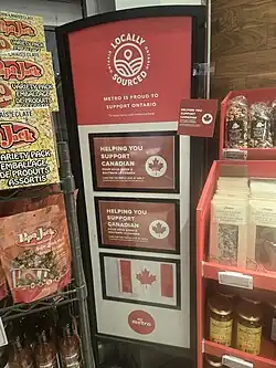Canadian businesses have put up signs encouraging customers to buy Canadian products,[9] or tags identifying made-in-Canada products.[10][11] The Guardian cites Kenneth Wong, an associate professor at Queen's University, as saying "he had been surprised by an apparently organic response among Canadian consumers: on a visit to his local grocery store, homegrown apples were sold out, while next to them, a bin of US apples appeared to be untouched."[12] Some Canadians have voiced willingness to pay more to avoid American products.[2] The boycott led to a marked increased in consumer complaints about labelling to the Canadian Food Inspection Agency, in particular relating to country of origin, given the boycott participants' reliance on labels to avoid US products.[13]