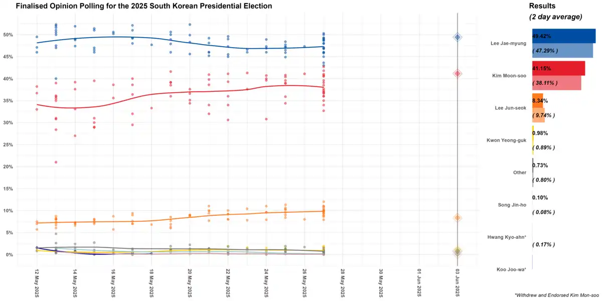 - ^ Haye-ah, Lee (3 June 2025). "Exit polls project Lee will win around 50 pct of vote, leading Kim by at least 7.5 points | Yonhap News Agency". Yonhap News Agency. Archived from the original on 3 June 2025. Retrieved 3 June 2025.