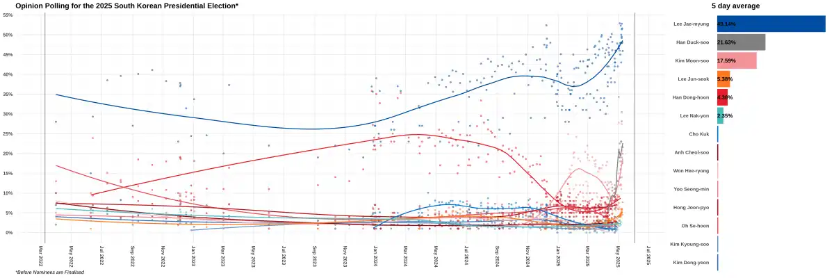 On 12 April 2025, the Democratic Party of Korea announced that its presidential primary would equally weight between votes by dues-paying members and a public poll conducted by two polling companies that would survey one million people. The final decision would be released on 27 April, following a full party vote on 14 April and an online vote by its central committee on 15 April. This was the first DPK primary to include participants aged 16 to 18[18] , following a 2022 revision to the Political Parties Act that lowered the minimum party membership age from 18 to 16.[19][20] On 18 April, the Democratic Party held its first televised debate.[21] On 23 April, the party held its second televised debate. During the debate, the three candidates discussed constitutional amendments to either shorten presidential terms or allow multiple terms, and when the changes would take effect.[22] On 27 April, the party officially nominated Lee Jae-myung after a primary landslide.[23]