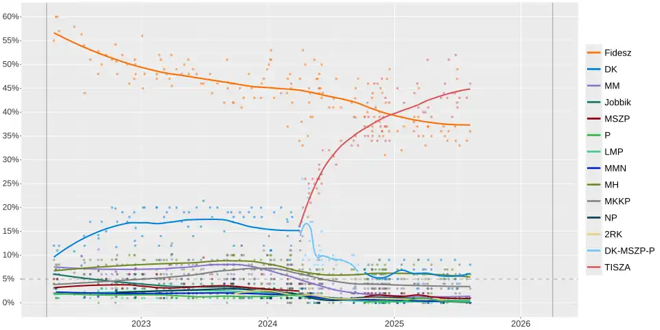 On 10 April, Magyar announced his bid to run in the European Parliament election with the at that point unknown Respect and Freedom Party, which finished in 2nd place its nearly 30% result, the highest number and percentage of votes by any non-Fidesz party since 2006, eventuating collapse for other opposition parties with it and a new situation in Hungarian politics. Following the mid-term elections, the strenghten of TISZA was continued and according to the independent/opposition-aligned polls, by the end of the year it had become the most popular political party in Hungary, or at least a close competition with Fidesz can be expected in the next general elections.[12] Therefore, some opposition parties, such as Everybody's Hungary People's Party or Momentum Movement have decided not to run in the next election in the interest of government change.[13][14]