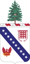 Insignia on Shield: Portcullis is upper right. In ancient fortress warfare the portcullis barred the gateway to the hostile invader. Its color (red) symbolizes the artillery. The phoenix in the lower left is the crest of the City of Portland, the seaport and chief gateway of Maine. It represents the city (formerly named Falmouth) rising from its ashes after being destroyed by fire three times; by the Indians in 1676, by the French in 1690, and by the English fleet in 1775.[10] It is also the crest of the Harbor Defenses of Portland to which the regiment was assigned for service. It further denotes the successive rebirths of the regiment following the civil, Spanish, and World wars. The ten stars running from upper left to lower right represent the ten major battles engaged in by the Regiment. The blue band serving as background for the stars signifies the intermittent existence of the regiment as infantry, especially during the Civil War.[9]