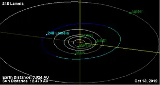 248 Lameia is a typical main belt asteroid. It was discovered by Austrian astronomer Johann Palisa on 5 June 1885 in Vienna and was named after the Lamia, a lover of Zeus in Ancient Greek mythology. 248 Lameia is orbiting the Sun with a period of 3.88 years and a low eccentricity (ovalness) of 0.067.[2] The semimajor axis of 2.47 AU is slightly inward from the 3:1 Kirkwood Gap.[4] Its orbital plane is inclined by 4° to the plane of the ecliptic.[2]