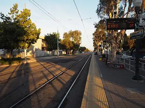 There are two tracks running in the center of Commercial Street, each with a side platform. The westbound platform is to west of the 25th Street intersection while the eastbound platform is to the east.