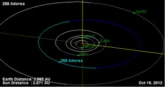 268 Adorea is a very large main belt asteroid, about 140 km (87 mi) in width. It was discovered by Alphonse Borrelly on 8 June 1887 in Marseille. This asteroid is a member of the Themis family[3] and is classified as a primitive carbonaceous F-type/C-type asteroid. It is orbiting the Sun at a distance of 3.09 AU with an orbital eccentricity (ovalness) of 0.14 and a period of 5.44 yr. The orbital plane is tilted at an angle of 2.44° to the plane of the ecliptic.[1]