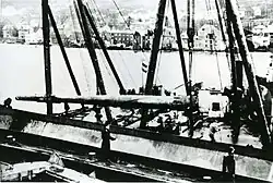 ![]() Gun from Gneisenau being unloaded in Bergen, Norway, prior to installation at Fjell festning, late 1942-early 1943 | |