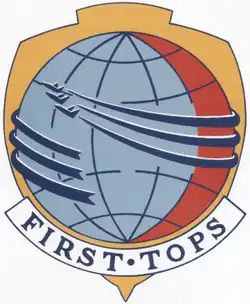 - ^ Approved 29 June 1945. Description: On a light turquoise blue disc, edged black, a caricatured cat wearing a red cape, brown aviator's helmet and white goggles, piloting a gray .50 caliber aerial machine gun with red and white tail, winged yellow orange, with an auxiliary gray wing tank under each wing, all in flight toward dexter, in front of a large white cloud formation.