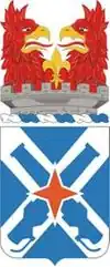 Crest: The tower symbolizes a strong defense and military preparedness. The griffins, personifying vigilance, stand prepared to meet all threats. Red denotes courage and zeal. The tower and fleur-de-lis commemorate the unit's World War II service in Northern Europe.