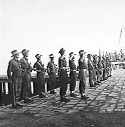 Under Dyke's command, the 12th/40th deployed from Darwin to Timor in early September. They arrived at Koepang, in the middle of the month, shortly after the Japanese surrender on 11 September,[10] which took place on board the survey ship HMS Moresby, in Dyke's presence just prior to him handing over as 33rd Brigade commander.[11][12] At Koepang, the 12th/40th established themselves in former Dutch barracks and began patrolling and internal security duties. This included collecting Japanese prisoners of war, distributing food and supplies, identifying war criminals and overseeing Japanese security details and work parties, collecting weapons and ammunition, and reconstruction efforts.[10][13][14] Arrangements were also made to return around 200 Australian former prisoners of war back to Darwin.[15]