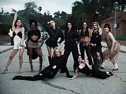 Between several match cuts, Charli appears in various locations: at a gym, where she pours herself a glass of wine in a white tank top with no bra on[80] while she stands on a vibration plate and is accompanied by Sennott and Fox, who are unenthusiastically lifting weights and taking selfies; in a hospital hallway, where she straddles an old man in a gurney next to Gabbriette and Consani, both of whom are posing smoking cigarettes and posing next to her; in a photo booth next to actress Hari Nef and influencer Blizzy McGuire; and in the street, where influencers Emma Chamberlain and Quenlin Blackwell apathetically observe a car accident they just caused. Make-up artist Isamaya Ffrench also appears in the video.[78] Toward the end, Chloë Sevigny exits a black Porsche 992 convertible[81] and tosses a cigarette into a garbage can, lighting its contents on fire, as she and Charli XCX strut down the street. The video ends with Sevigny, Charli XCX, and several other girls, including Tess McMillan, posing at the end of the street.[13][28] The video also features appearances from Cook,[82] Anna Collins—the sister of photographer Petra Collins, who photographed Charli XCX's campaign for Skims—Matisse Andrews, Sakura Bready, Peri Rosenzweig and Niki Takesh.[15][3] The video's cast also consists of multiple transgender women, including Nef, Consani, and McGuire.[83]