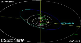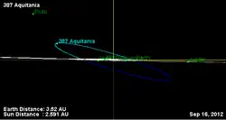 - ^ a b c d e f g h i j k "JPL Small-Body Database Browser: 387 Aquitania (1894 AZ)" (2017-09-30 last obs.). Jet Propulsion Laboratory. Archived from the original on 16 September 2020. Retrieved 19 October 2017.