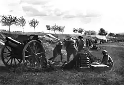 Throughout the 1930s the number of active personnel remained low and out of necessity training opportunities were limited.[64] After 1936, however, the Army attempted to improve the conditions of service for its members and to reinvigorate the training program, while individual units began to undertake their own recruiting campaigns.[65] Nevertheless, it was not until 1938, as tensions grew in Europe and the prospect of war became more likely, that an attempt was made to expand the establishment of the Militia. At this time an effort was made to determine the readiness of the Militia to expand if mobilised. During the continuous training camps undertaken throughout 1938, each component unit was assessed with mixed results.[66] The following year, 1939, saw further expansion and by the end of April of that year, the division's posted strength had grown to 9,589 personnel.[67] As a part of this expansion, the divisional artillery was expanded by the re-raising of the batteries that had been disbanded in 1922.[68]