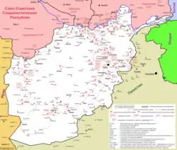 The Army was re-created on December 16, 1979, in the Turkestan Military District on the directive of the General Staff of the Soviet Armed Forces.[7] General-Lieutenant Yuri Tukharinov, the first deputy commander of the Turkestan MD, was appointed as the army commander. To cover the boundary with unstable Afghanistan, three motor rifle divisions (the 5th Guards, 108th and 68th) were deployed to the region. From December 3–16, 1979 two battalions of the 345th Independent Guards Airborne Regiment and the special operation GRU unit (Muslim battalion) were deployed to Bagram Airfield near Kabul as the situation in the Afghanistan had deteriorated.[8]
