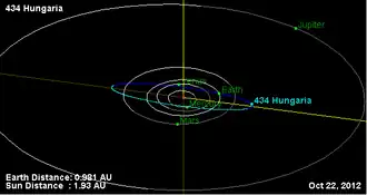 434 Hungaria is a relatively small asteroid orbiting in the inner asteroid belt. It is an E-type (high-albedo) asteroid. It is the namesake of the Hungaria asteroids, which orbit the Sun on the inside of the 1:4 Kirkwood gap, standing out of the core of the asteroid belt.[3]