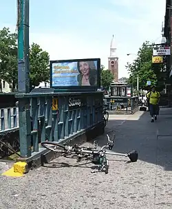 The southbound platform formerly had an exit-only at the center that led to 46th Street. Evidence of this includes a gated door on the platform wall and adjacent "EXIT" signs.[38][39] The northwest corner exit was closed after it was accidentally destroyed by nearby construction workers. On May 16, 1979, Community Board 7 held a meeting to determine whether residents wanted the entrance closed.[40] The board's chairman cited crime as a reason to close the entrance. The New York City Transit Authority promised to comply with the wish of the board, and the entrance was closed.[41]