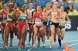 The championship records for the event are 12:52.79 minutes for men, set by Eliud Kipchoge in 2003, and 14:26.72 minutes for women, set by Hellen Obiri in 2019.[1] The world record has never been broken or equalled at the competition by either men or women, reflecting the lack of pacemaking and athletes' more tactical approach to championship races.[2] Similarly the women's 3000 metres world record was not improved during its 13-year history. The championship record for that event was set on its last appearance in 1993, by Yunxia Qu with a time of 8:28.71 minutes.[1]