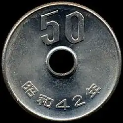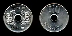 The 50 yen coin (五十円硬貨, Gojū-en kōka) is a denomination of Japanese yen. These coins were first minted in 1955, and concurrently circulated alongside a banknote denomination of the same amount. 50 yen notes were eventually pulled from circulation shortly before the center of the 50 yen coin was holed. The first yen coins were made of pure nickel and slightly larger than the ones used today. Changes to the 50 yen coin were made in response to events surrounding the 100 yen coin. The public wanted a different looking 50 yen coin while the mint wanted to stay consistent with the material used to make the coins. The current design was first minted in 1967 using Cupronickel rather than pure nickel.[1] The 50 yen coin continues to be minted for commerce, and is a collectible among hobbyists.