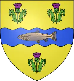 The battery coat of arms is a gold-blue-gold stable belt derived from the "Shield" of Nova Scotia 1867–1929, representing the earth banks either side of the St Lawrence River as authorised circa 1904. The shield depicts 3 thistles, which represent the 3 municipalities of Nova Scotia (New Scotland) and the salmon is shown swimming west.