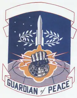 - ^ Approved 2 March 1962. Description: On a rectangular area arched in chief and base per pale dark blue spattered with stars and Air Force blue, the top of a silver-gray globe issuing from base, grid lines dark blue; all surmounted by a white missile palewise pointing upward shaded silver-gray, emitting an Air Force golden yellow blast-off vapor to base, edged white, surmounting the vapor cloud an armored hand, dark blue, highlighted white and shaded silver-gray, grasping three white lightning streaks edged red; encirdling the missile a white stylized olive wreath.