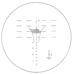 The sights are optical; three types of different optical sights exist (Kr, D and NE), of which two (Kr and D) share the same reticle; the NE sight has a stadiametric rangefinder reticle.[2] There's provision for illuminating the reticle and the stadia marks in the NE sight.