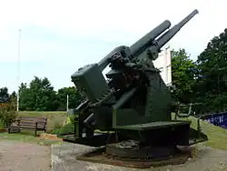 The TA's AA units were mobilised on 23 September 1938 during the Munich Crisis, with units manning their emergency positions within 24 hours, even though many did not yet have their full complement of men or equipment. The emergency lasted three weeks, and they were stood down on 13 October.[10] In February 1939 the existing AA defences came under the control of a new Anti-Aircraft Command. In June, as the international situation worsened, a partial mobilisation of the TA was begun in a process known as 'couverture', whereby each AA unit did a month's tour of duty in rotation to man selected AA gun and searchlight positions. On 24 August, ahead of the declaration of war, AA Command was fully mobilised at its war stations.[11]