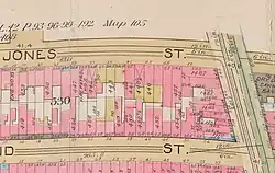 A real estate transaction of 1888 showed that a plot of land located at the back of 57 Great Jones Street and the back of 342 Bowery had by then been added to Lot 132.[21] Measuring about 25 by 25 feet, this addition to the lot appears in a fire insurance map of 1891. The map mislabels the address of the lot as 53 rather than 57 Great Jones Street, and it treats 57 Great Jones Street and 456 Bowery as if they were the same building. It shows Lot 132 to have three brick buildings, the one facing Great Jones Street and two behind it.[22] Fire insurance maps made in 1893 and 1897 give the same information except that in 1893 there is only one building behind the building that faced 57 Great Jones Street (a wood-frame structure) and in 1897 there is a brick building in that location and a frame building behind it.[23][24] A fire insurance map of 1911 is similar to the 1893 and 1897 maps. It treats 57 Great Jones Street and 346 Bowery as if they were the same building, but it does give the correct house number to 57 Great Jones Street.[25]