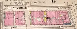 - ^ George Washington Bromley (1911). "Plate 8; Bounded by W. 3Rd Street, Great Jones Street, E. 3Rd Street, Avenue A, Essex Street, Broome Street, And West Broadway" (Map). Atlas of the City of New York, Borough of Manhattan, Volume Two. Philadelphia, PA: G.W. Washington Co. Retrieved March 3, 2025.