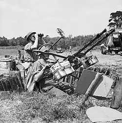 By 20 May, 1st and 2nd S/L Btys of 1st S/L Rgt, with part of 2nd S/L Rgt, were deployed as a screen of S/L detachments one mile apart round the east side of Calais and Lt-Col Goldney of 1st S/L Rgt was appointed AA Defence Commander for the town. They were joined on 22 May by 30th Infantry Brigade, just before advanced German troops began probing the defences, beginning the Siege of Calais. On the night of 22/23 May the AA units engaged Luftwaffe raiders that bombed Calais, starting fires. But ground attack was now the biggest danger, and the S/L men had to man the perimeter as infantry, a role for which they (mainly older Territorials, raw militiamen and a few ex-RE reservists) were untrained. Nevertheless, they put up a stout fight, halting tank columns for several hours before they were overwhelmed. The remnants were forced back to the citadel and harbour, where some were evacuated by sea but most became Prisoners of war (PoWs) when the citadel fell on 26 May. The town's three-day defence, holding up Heinz Guderian's XIX Panzerkorps, had provided some respite for the Dunkirk evacuation.[9][18][19][20][21][22]