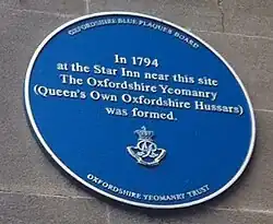 After Britain was drawn into the French Revolutionary Wars, Prime Minister William Pitt the Younger proposed on 14 March 1794 that the counties should form a force of Volunteer Yeoman Cavalry (Yeomanry) that could be called on by the King to defend the country against invasion or by the Lord Lieutenant to subdue any civil disorder within the county.[2] In response to this call, a meeting of 'Nobility, Gentry, Freeholders and Yeomanry' was called at the Star Inn in Cornmarket, Oxford, in 1794.[3] This led to the formation in May 1798 of a troop of yeomen known as the County Fencible Cavalry at Watlington, under the command of the Earl of Macclesfield. Three more troops were soon raised in the county, giving the following by the end of the year:[4][5][6][7][8]