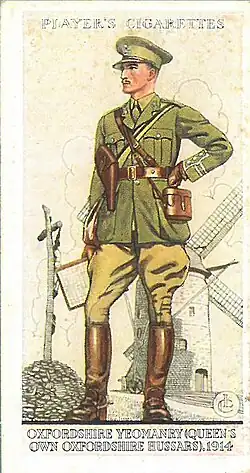 The Queen's Own Oxfordshire Hussars (QOOH) was a Yeomanry Cavalry regiment of the British Army's auxiliary forces, formed in 1798. It saw service in the Second Boer War with 40 and 59 Companies of the Imperial Yeomanry and was the first Yeomanry regiment to serve in Belgium and France during the Great War.[1] After almost four years of Trench warfare on the Western Front, where cavalry had been superfluous, the QOOH led the advance during the Allies' victorious Hundred Days Offensive in 1918. In 1922, the QOOHt became part of the Royal Artillery and during World War II it served as anti-tank gunners at Singapore and in North West Europe. After a series of postwar mergers and changes of role, the regiment's lineage is maintained by 142 (Queen's Own Oxfordshire Hussars) Vehicle Squadron, 165 Port and Maritime Regiment RLC.