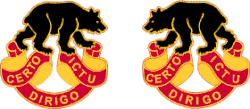 - Symbolism: The design is adapted from the crest of the Coast Defenses of San Francisco where the old regiment and the majority of the companies of same were stationed since 1901 and where the new regiment will be organized and assigned.[16] The motto "CERTO DIRIGO ICTU" (I Aim With a Sure Blow) is indicative of the character of the bear.[15]