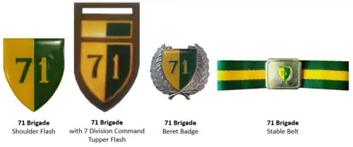 The first shoulder badge to be worn by 71 Motorised Brigade headquarters personnel was approved on 15 March 1978. 71 Motorised Brigade's flag was a springbok in green and old gold and had been approved on 28 July 1988 In October 1988, the Brigade's beret badge was also approved.