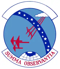 - ^ Approved 31 December 1959. Description: On a light blue disc, a white cloud issuing from sinister (left) chief, outlined Air Force blue, issuing from the cloud, bend sinisterwise, three red air refueling booms pointing to three red stylized aircraft in dexter (right); all above the top of a white globe issuing from base and grid lines of Air Force blue, over all, bendwise arched, an Air Force blue ribbon spattered with white stars. Significance: The emblem symbolizes the squadron's support to SAC through air refueling of bombers that provide the war deterrent force of the United States. Through its direct support, the squadron helps to further peace throughout the world. The emblem represents a refueling operation. The dark blue band with stars identifies the operation with the Strategic Air Command and represents the night refueling capability. The background represents the unit's daylight capability and the globe is symbolic of global operations.