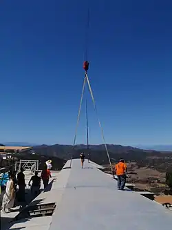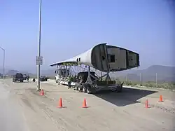 Hertz convinced the client to purchase the 747 airplane, originally worth about $25 million when Boeing completed it in 1970, for US$35,000. Mark Thompson of Thompson Aviation sold the airplane and his team detoxified, cut apart, and transported the plane for airlift. Using a laser and the cut-off saws at the Victorville Airport, home of the second largest airplane graveyard in the nation, the cockpit and tail were removed and the fuselage cut longitudinally. Next, transverse sectioning reduced large segments of fuselage and the wings to a manageable size for transport. A truck carried the parts, measuring 47 by 125 feet (14 by 38 m), successfully without damage. Seven California Highway Patrol vehicles escorted the truck during the night and closed multiple lanes of three major freeways, State Routes 2 and 15, and US Route 101, to accommodate the vehicle. The wings traveled from the Southern California Logistics Airport aircraft boneyard to Camarillo Airport in Camarillo, California, located 10 miles from the site. At that point, because each wing weighed approximately 20,000 lb (9,100 kg) and the only way to transport such heavy, unwieldy sections to a remote destination was from above (navigation by truck was deemed impossible), the wings needed to be cut in two for proper positioning for transport by helicopter, which was completed by a Columbia Model 234 operated by Columbia Helicopters Inc. of Portland, Oregon and took over two hours to complete. The helicopter positioned the wings on a large pile of tires at the site. The wings were then spliced back together and lifted onto columnar supports, attaching the custom fabricated steel brackets on the columns to the engine mounts on the wings. The wings touched the ground at few points creating minimal foundation requirements.